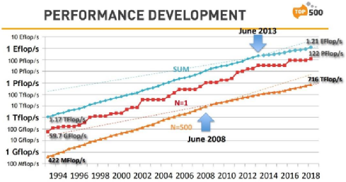 根据中国科学院院士钱德沛2019年所做的一个报告,1993-2012年,超级计算机的性能大约每10年提高1000倍,从2013年起,上升速率变缓,降低为每10年100倍左右。但无论如何,超级计算机性能增长的速度远高于民用PC的性能增长,这说明超级计算机性能提高固然要靠单芯片性能的增长,也非常依赖系统规模的扩大。