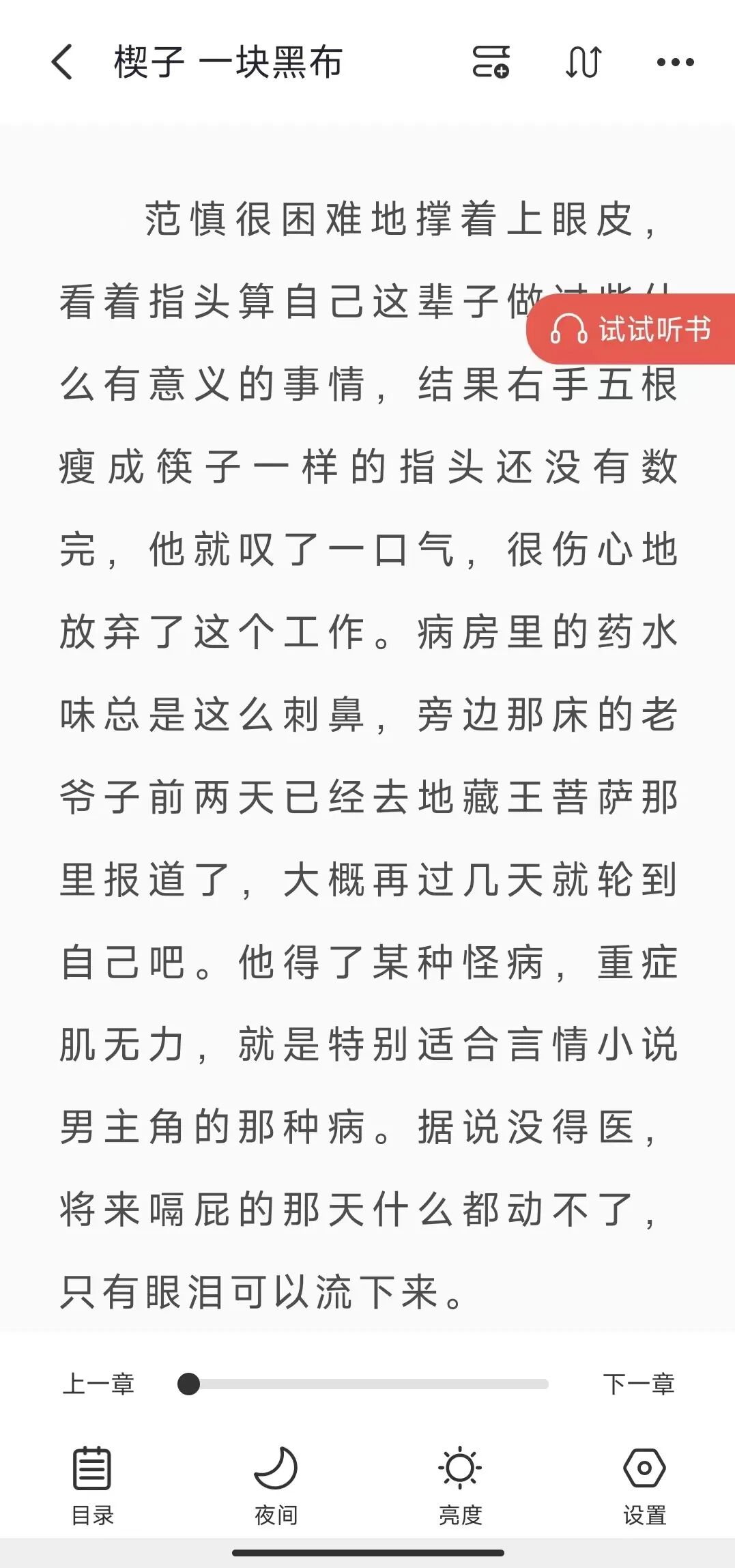 阅读小说的界面清晰,排版舒服,还可以设置夜间模式,调节亮度,设置听书,还可以在【设置】中调节字体颜色、字体大小背景颜色等等。