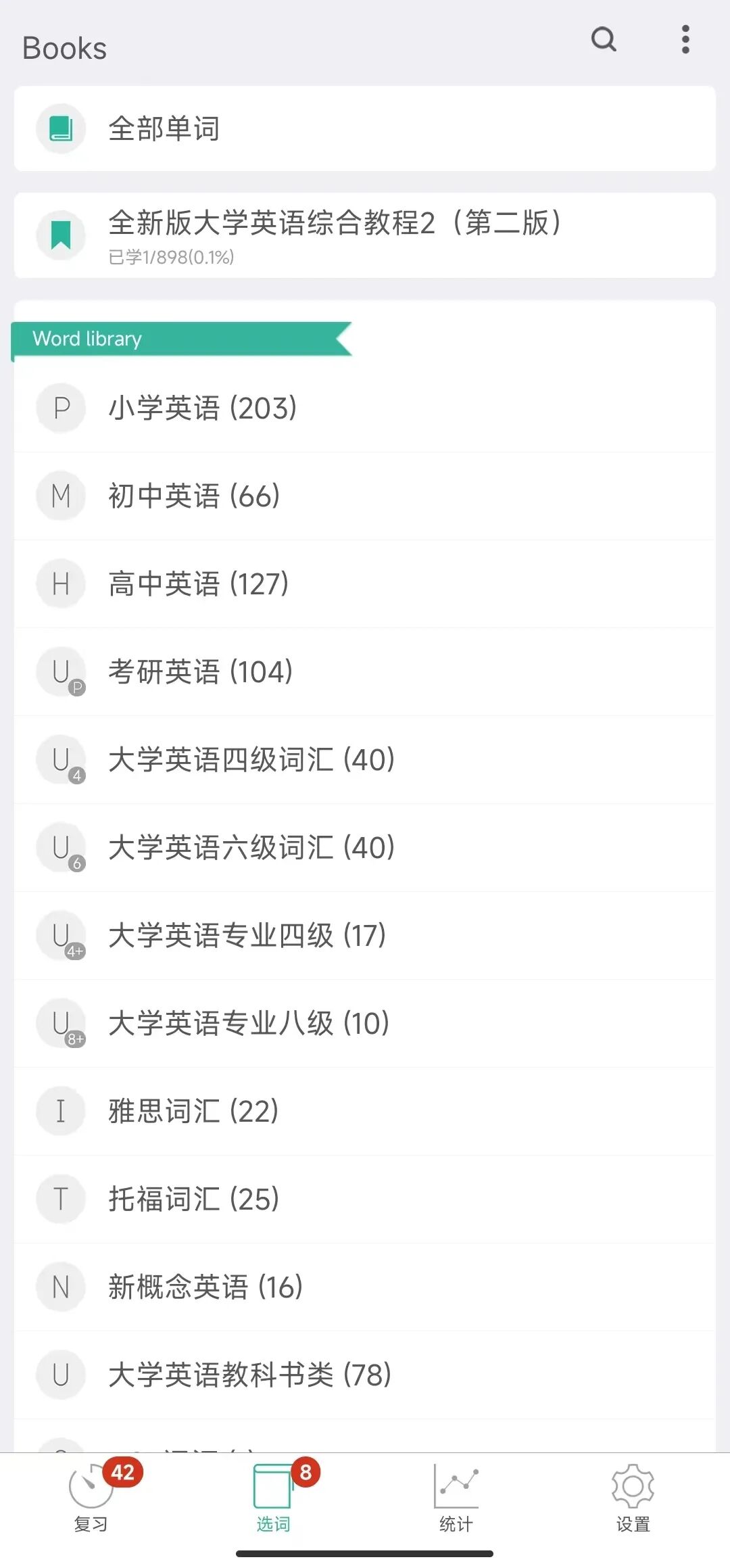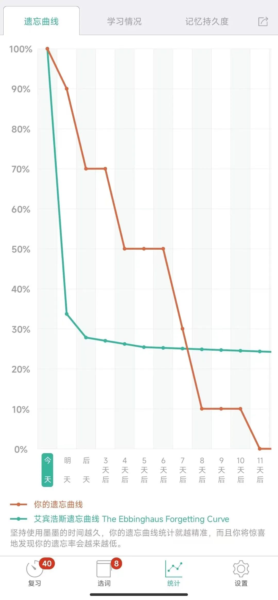 软件还会统计你的学习情况,也可以在设置里设置每日学习量和复习提醒等等。