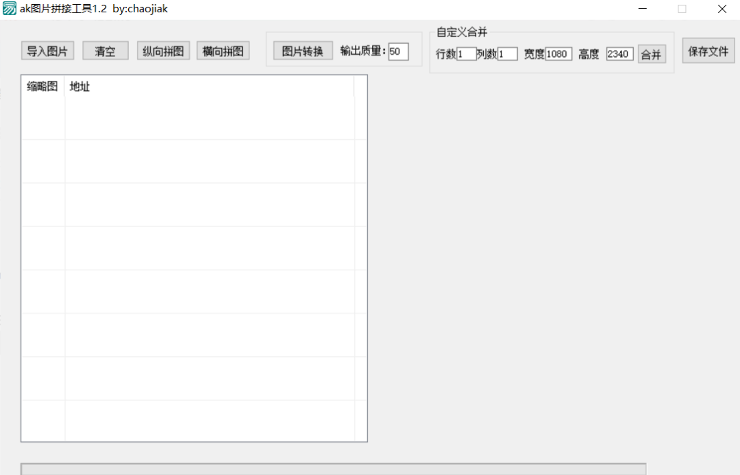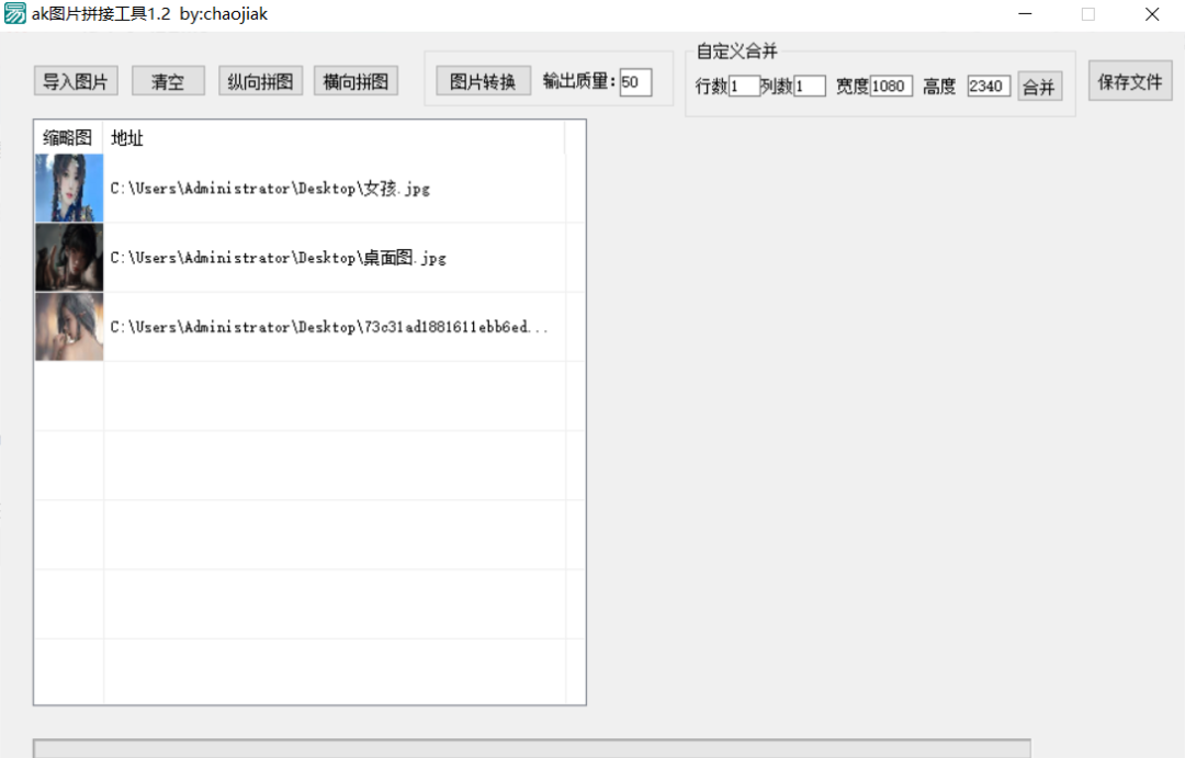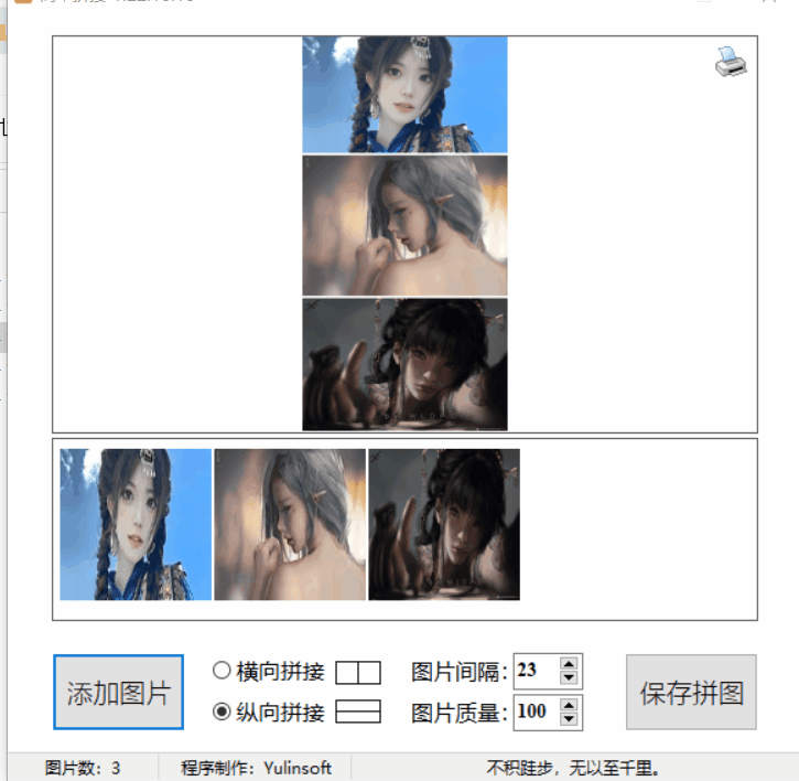 这款是易语言编写的软件,杀毒软件可能会报毒,但软件无毒无害可放心使用。直接把需要调整的图片拖入软件中,最后点纵向和横向拼图即可。