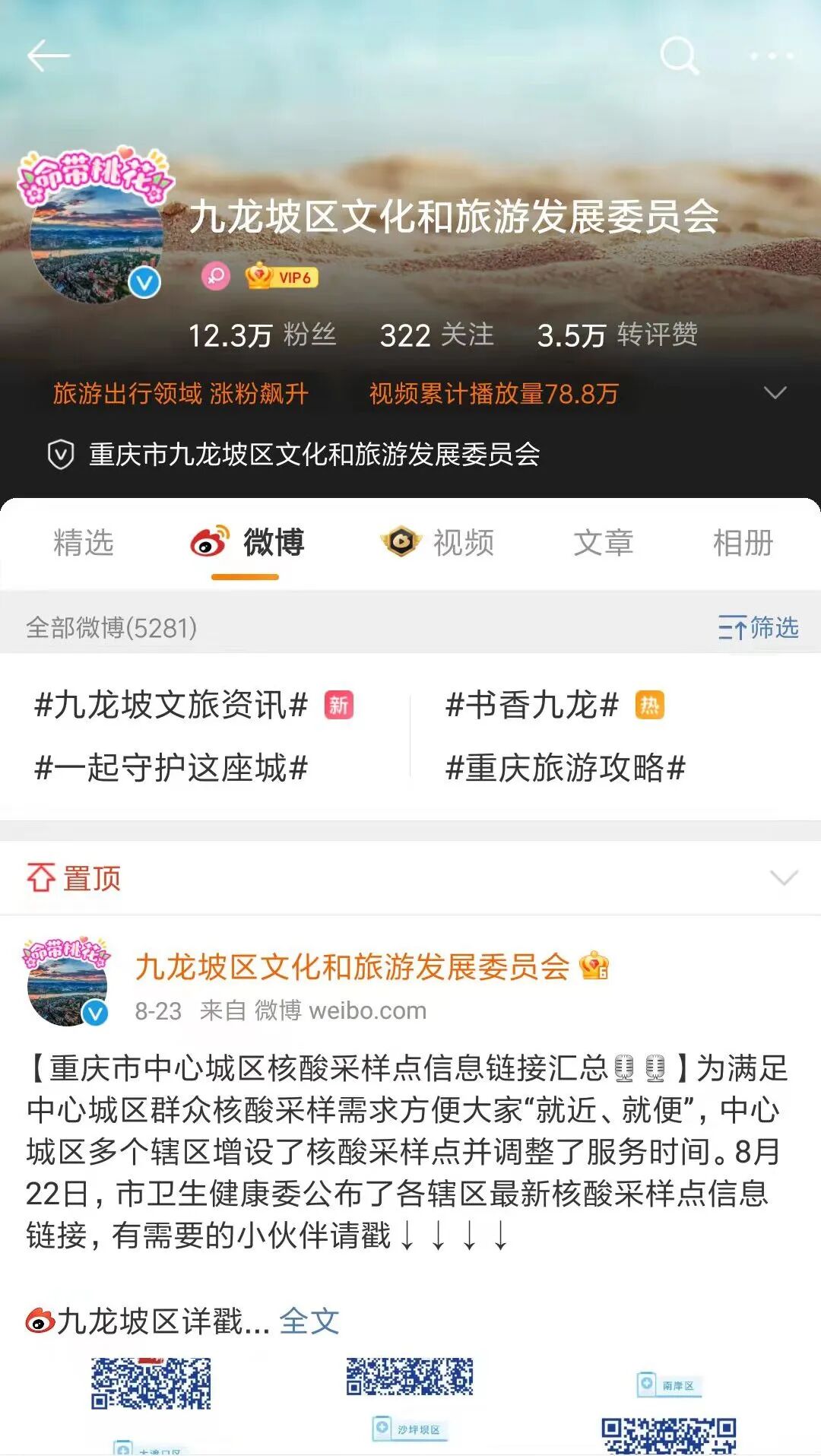 “九龙坡区文化和旅游发展委员会”新浪微博主要发布九龙坡文旅推介、节会活动和各类文旅资讯。