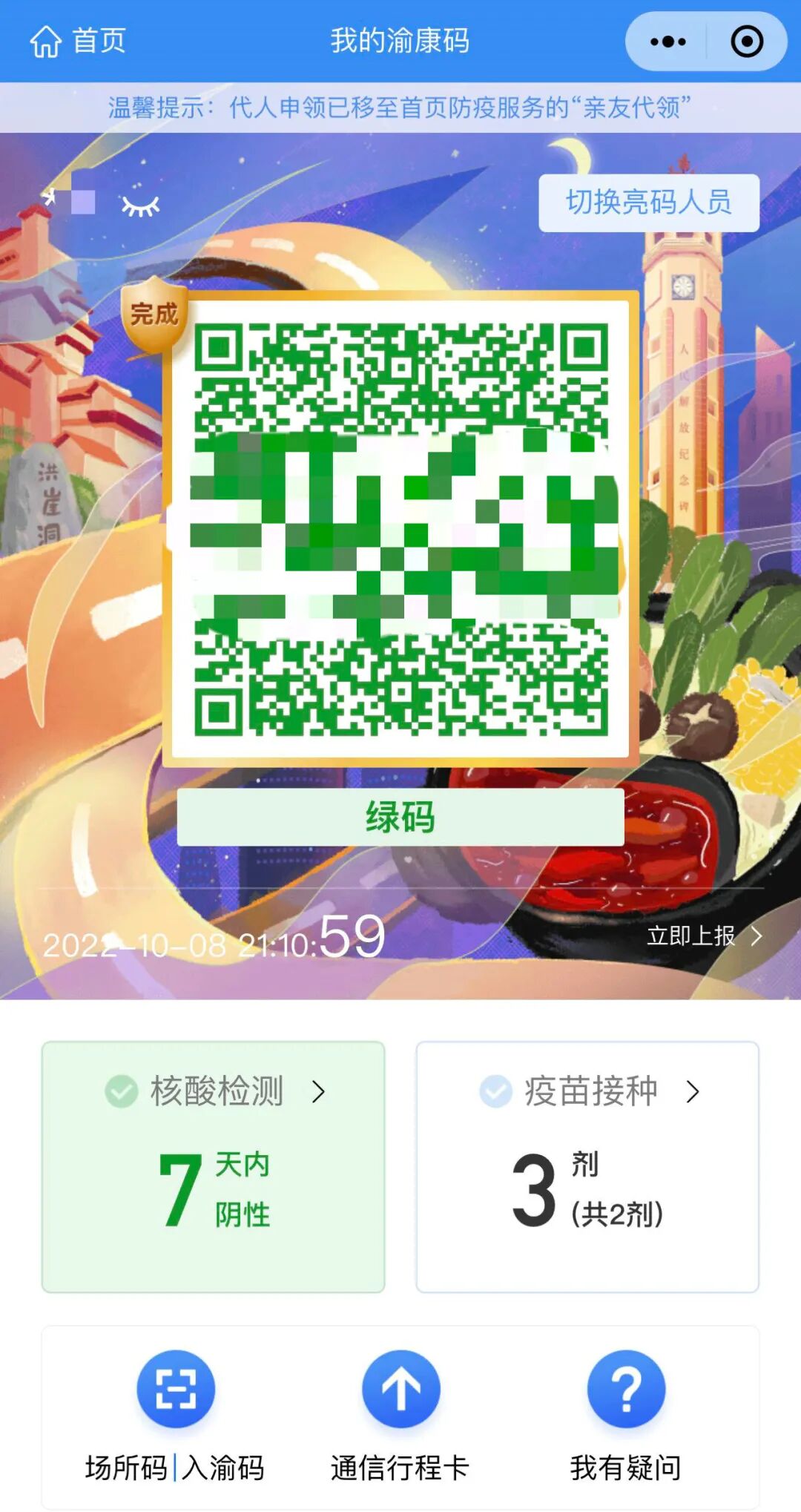 在这个功能平台里,“渝康码”二维码仍是核心,“绿码”“黄码”“红码”、弹窗等,反映了持码人实时的健康状况。随着疫情防控要求,功能平台不断开发(链接)了“场所码”“入渝码”“行程码”“社区报告码”等功能,它们则和大家的出行息息相关。
