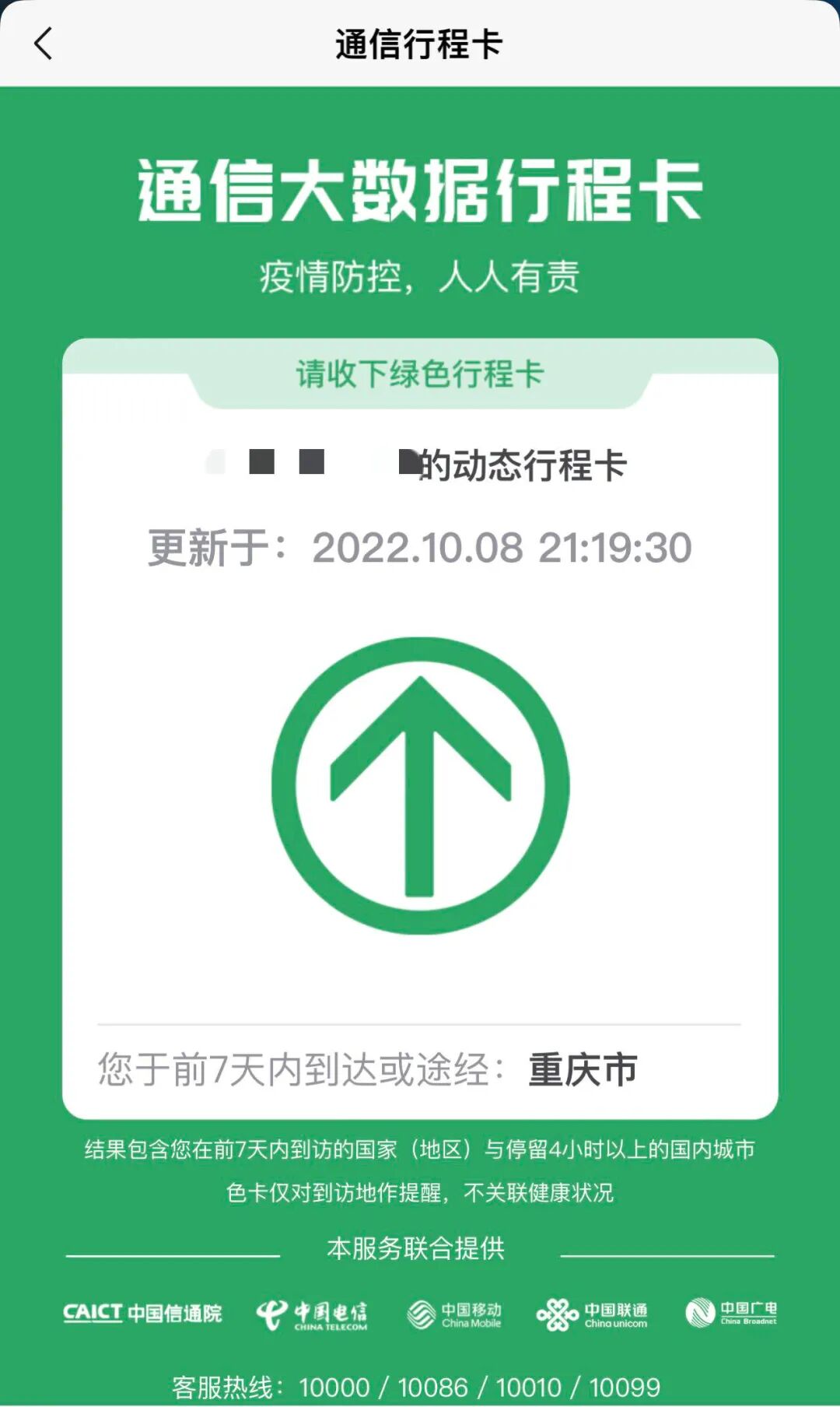 ——“行程码”:“渝康码”平台主页“通信行程卡”按钮,点击按钮即显示过往7天内,你到访过的国家(地区)和连续停留达到4小时的国内城市。查这个码就是为了看看你近期是不是去过疫情风险较高地区。