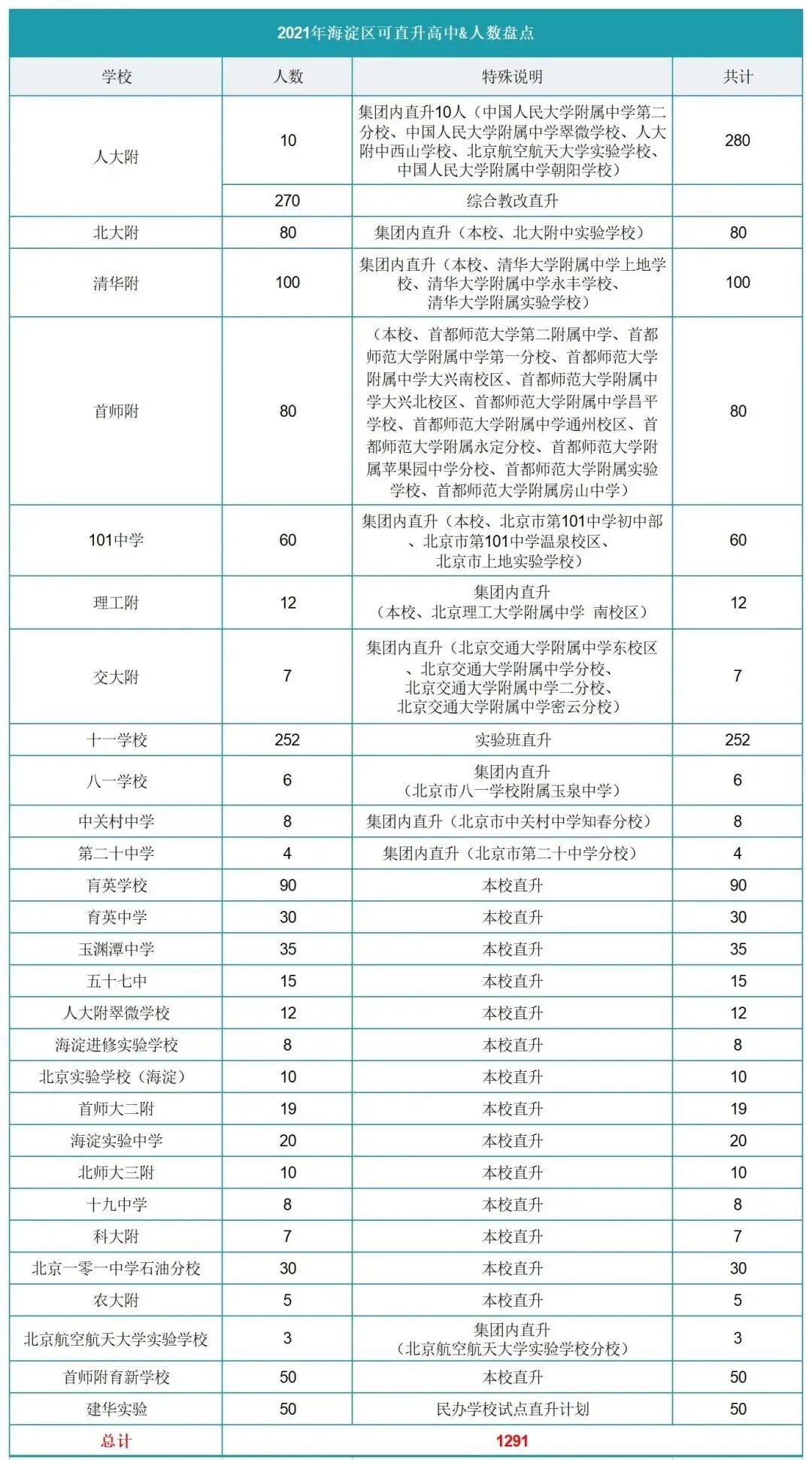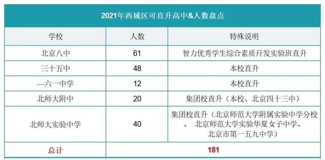 中考有一种升学途径是“直升”,不看成绩即可被高中学校录取。直升通常是针对集团内学校的直升,也就是说,本校高中会给集团内初中学校一定名额,在中考时,可不看分录取。直升有哪些类别?2、本校直升:本校通过筛选、签约本校的一部分孩子,直接升入高中部;3、集团校直升:集团校内给予一定的名额,可以直升到本校高中;4、实验班直升:本校通过筛选、签约本校的一部分孩子,进入实验班,直升至本校高中指定的实验班当中;5、综合教改直升:个别学校有综合教改直升的招生计划,人大附中2021年有270个综合教改直升的名额;1、上述数据来源于2021中招简章,数据量较大,如有错误,欢迎批评指正。2、2021年共有50所高中有直升计划,共计招生2119人。3、有直升资格的学校必须按照市教委有关要求在规定的时间和范围内公布直升方案和直升考生名单。各区在规定的时间将直升考生名单报考试院备案,备案后的考生名单不能更改。选择直升的考生须将学校招收此类考生的普通班专业填报在统一招生第一志愿第一专业栏内。答:直升是统招批次的一种招生方式,包含集团内直升、本校直升、实验班直升等,考生如果想在校内直升,一定要与学校加强联系。签约是学校与考生家长私下进行的协议,需要考生与家长多联系外校进行签约。不管是直升还是外校签约,都比较看重考生的成绩,所以大家一定要多提升自己的成绩与排名。答:享受市级三好学生、本校直升、集团内直升等各类直升待遇的考生,须将该校招收直升学生的普通班的专业填报在统一招生第一志愿第一专业栏内,方可以直升考生身份被该校录取推荐阅读: