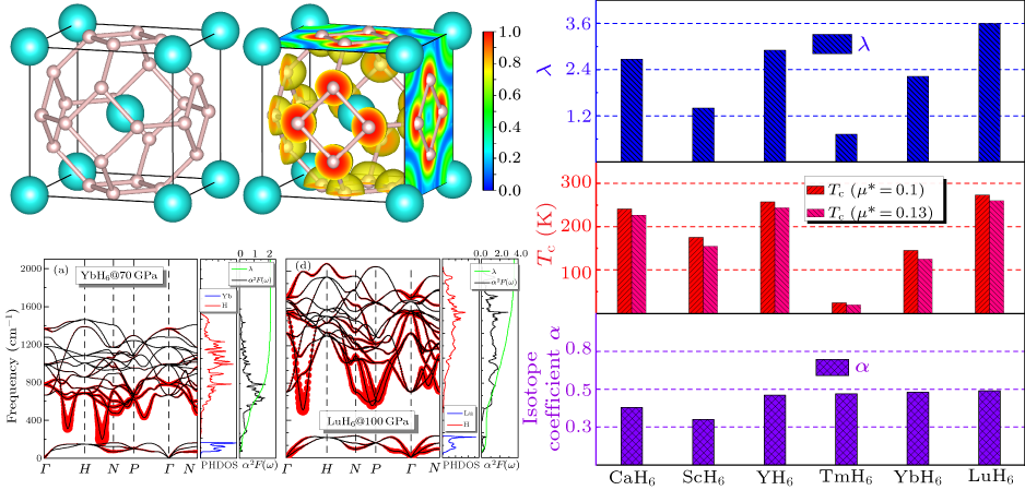 基于此,本文理论预测了两种可以在较低压力(<150Gpa)下实现高温/室温超导电性的具有方钠石结构的重稀土氢化物,YbH6和LuH6。这两种氢化物材料均属于亚稳相,YbH6在70Gpa下具有145K的超导转变温度,LuH6在100Gpa下具有273K的超导转变温度,接近室温。与50Gpa下具有稳定结构、临界转变温度为25K、非满占据4f轨道的重稀土氢化物TmH6相比较,发现满占据的4f轨道的YbH6和LuH6具有较强的声子软化,使得其电声耦合作用增强,提高了超导转变温度。