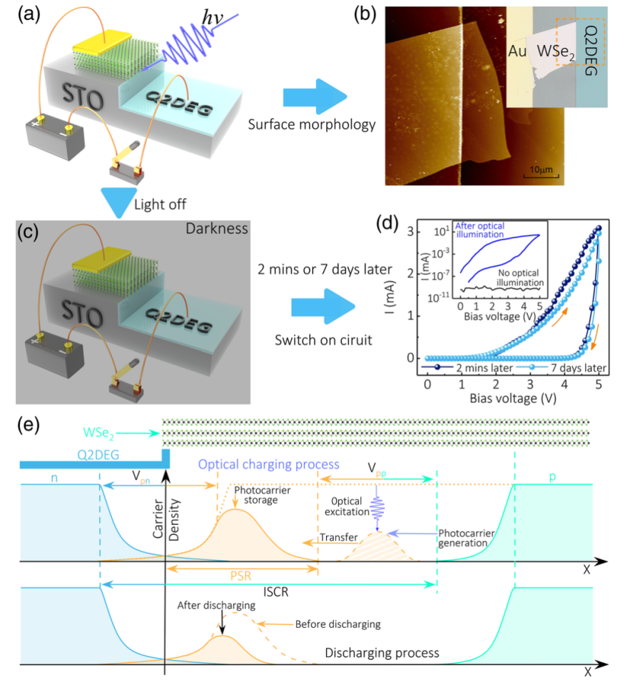 本文采用了构建范德华异质结的简单策略,将二维材料WSe2 层和准二维电子气结合,首次实现了单个设备的光电转换和存储。在进行光辐照后,器件产生的光生载流子可以存储长达 7 天;然后在黑暗中施加偏置电压,可以释放高达 2.9 mA极大光电流,同时实现了光电存储和转换,这种现象被称为可充电的光电导过程。与之前观察到的任何光电现象完全不同,在正常的光电导过程中,在其寿命结束时会发生电子与空穴的复合;相比之下,在可充电的光电导设备中,无限寿命的光生载流子可以在没有电子与空穴复合的情况下生成并存储,充电过程中光电转换和存储可以完全自激发。测试表明其临界温度以下的满载流子态和空载载流子态的电流比高达10的9次方,光充电时外量子效率为93.8%。文中提出一种理论模型来解释这种效应的产生机制,与实验数据非常吻合,为实现高效光电转换和存储器件提供了新的方向。