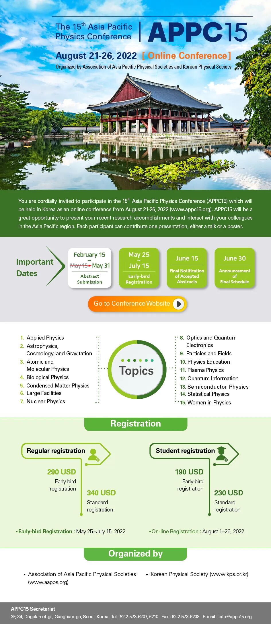 We cordially invite you all to the 15th Asia Pacific Physics Conference (APPC15) in August 21-26, 2022.