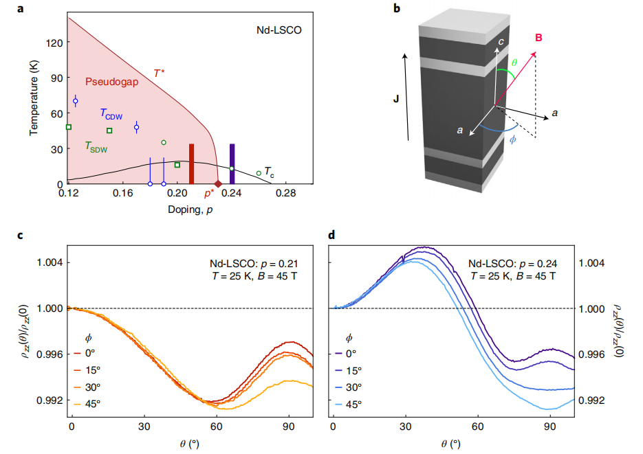 本文作者康奈尔大学Yawen Fang等采用角度依赖的磁电阻测量了La1.6–xNd0.4SrxCuO4铜酸盐的费米面。在赝能隙之外,通过拟合角度依赖的磁电阻数据,作者提取了一个与角度分辨的光电子谱非常一致的费米面几何形状。在赝能隙之内,角度依赖的磁电阻在性质上具有显著不同,揭示了费米表面的重构。作者排除了准粒子寿命的变化是造成这种重构的唯一原因,并发现其数据与具有小的节点口袋组成赝隙费米面最为一致,解释了铜酸盐中发现的赝能隙跃迁过程中载流子密度的下降。
