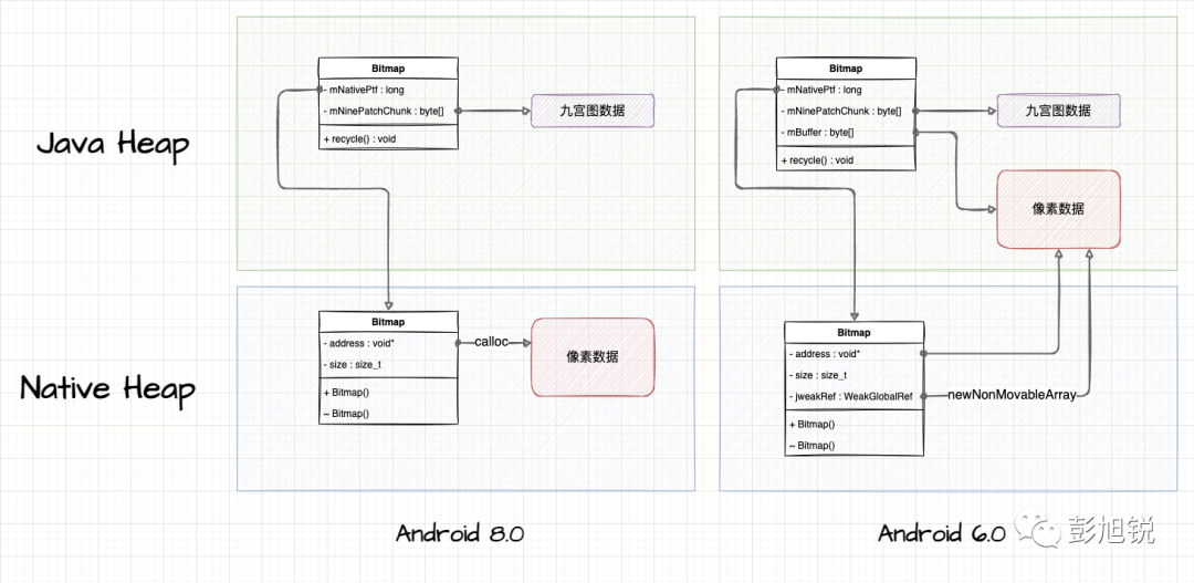 android.graphics.Bitmap.java ;Bitmap.cpp 为代表,除此之外还包括与 Skia 引擎相关的 SkBitmap、SkBitmapInfo 等一系列对象;其中,Java Bitmap 对象和 Native Bitmap 对象是分别存储在 Java 堆和 Native 堆的,毋庸置疑。唯一有操作性的是 3、图片像素数据,不同系统版本采用了不同的分配策略,分为 3 个历史时期:
