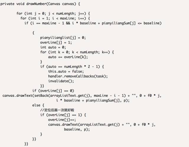 第二条线就是无数个第一条线加上时间点共同组成的,主要就是控制每次的不同,比如本文中增加的偏移量,是数据(本文中每一个字符的坐标)的变化,去影响onDraw方法,绘制不出东西呈现在屏幕上。第二条线还要控制好什么时候结束所有的第一条线,也就是整个动画结束的条件,本文中的例子讲是一旦所有字符的最后一行都超过或者等于TextView的基准线,那么整个动画结束。
