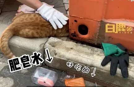 消防员先是用肥皂水湿润了橘猫学长的头,希望能将它拉出来,但学长实在太胖了,只拉出个耳朵...
