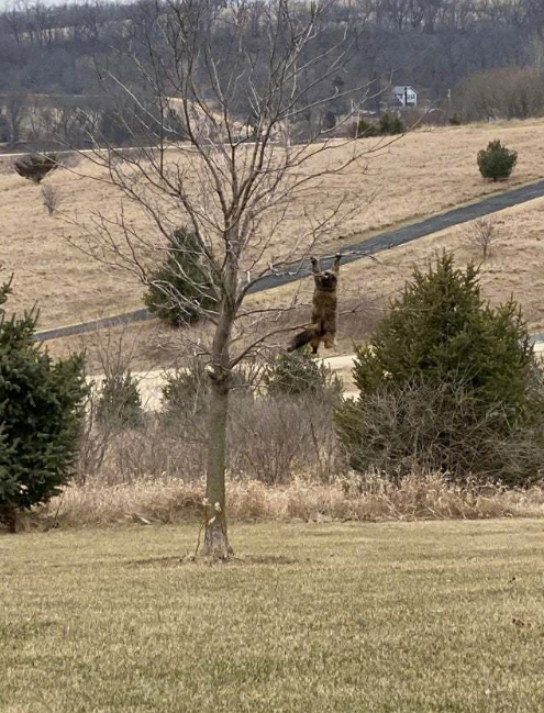 小猫咪不知道为什么抓着树枝,铲屎官赶紧抓住时机拍了下来...