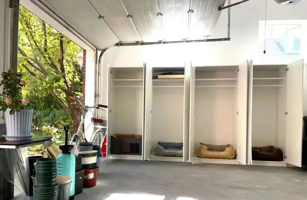 而她家里的车库,刚好有几个闲置的衣柜,于是她在衣柜里放上温暖的猫窝...