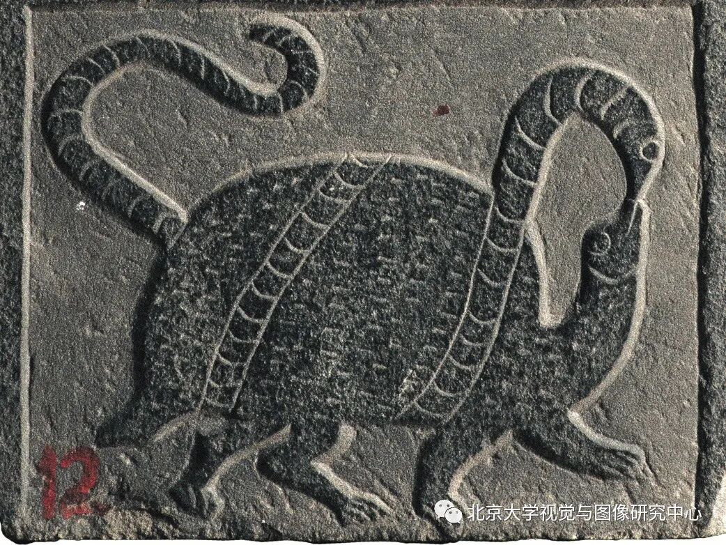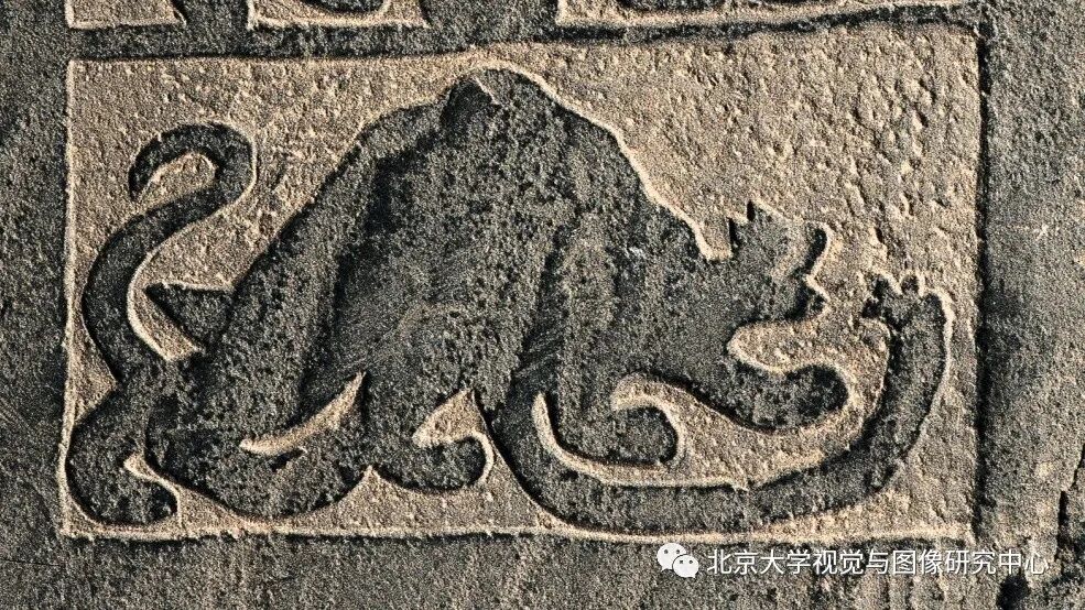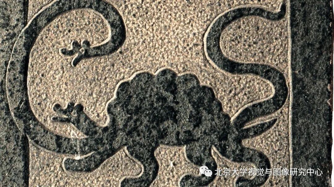 第二,玄武图像细节的非对称性。即左、右门柱总体对称,但从局部察看仍具有差异性。如一边门柱上蛇的口中伸出舌头,另一边则省略,这种细微区别并不严格固定左、右门柱。标本米脂县官庄1981年M1左门柱(MZ-010-02)的玄武图像中无舌头,右门柱(MZ-010-03)蛇的口中伸出长的舌头。同一地域,1981年征集的墓门面五石与上述正好相反,左门柱MZ-011-02(61)中的局部蛇有舌头,右门柱MZ-011-03(62)没有。玄武图像中蛇的尾巴一个从龟尾巴上部伸出,另一个从龟尾巴下部伸出;标本米脂县官庄1986年M1的横楣石等。米脂县官庄左门柱MZ-014-01中蛇的尾巴呈S形,右门柱MZ-014-02中蛇的尾端是漩涡形等。