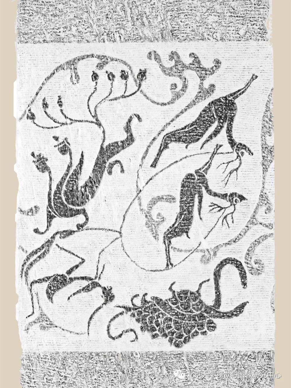 从整个墓门图像来看以玄武为中心的施用原则如下,A型玄武图像中门楣及其延伸于门柱部分为云气纹(含卷云鸟兽纹),门柱部分为东王公、西王母(或仙人等)与手持某物门吏的上下组合。而在B型玄武图像中则多在门楣及门柱部分刻画几何纹如菱形纹、折线纹、S型纹等。这表明陕北地区画像石的墓门图像存在两种雕刻系统,其中A型系统偏重于人们对墓室中阴间世界的具体营造,包括天界、人间及阴间的各种物像,而玄武是阴间象征图像的选择,从玄武代表方位中的北方及水中生物阴气的属性。刑义田《汉代画像中的“射爵射侯图”》一文中从榜题、格套的角度分析汉画的意义,以树、射鸟或猴和人、马的组合格套来解释画像石(砖)中的这一类题材。陕北汉画像石上马或牛车、树、门吏也形成一种格套,车是逝者生前地位的证明,汉代只有为官者才有资格乘车。SD-176和YY-013门柱上又刻有持彗门吏。出行车、门吏、玄武三者形成一种“时间段”的意象表达,即出行车仍然是逝者前往阴世的交通工具,持彗门吏是为逝者洒扫尘土的人。将墓主带到玄武所寓意的另一世,所以两门柱代表的是阴阳世界的转接点,门柱上的图像是来与去的连接,这是笔者倾向的陕北地区玄武图像进入画像石题材的主要原因。而它们之间更准确的对应关系还需要将来其他文献和图像的进一步补充。