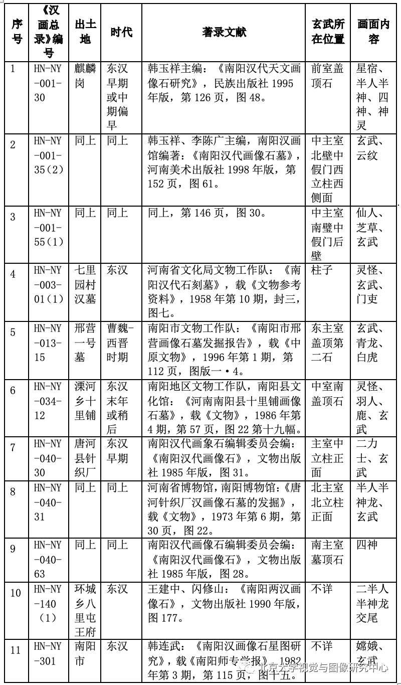 南阳地区出土画像石中刻有玄武图像的数量不及陕北,但因为大部分有完整的墓葬信息(表一),因而拟从两地区玄武图像的造型、所在墓室位置及其组合图像等差异性来揭示汉代画像石中玄武在不同地域墓室中的意义和作用。