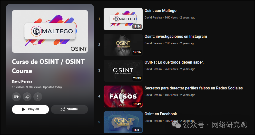 https://www.youtube.com/playlist?list=PLqM63j87R5p6dZeq1l_EIPP6NkJi51wET6. David Perira 的开源情报