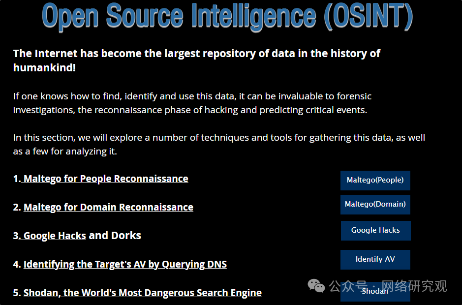 Null Byte 的 OSINT(开源情报)课程可能涵盖从互联网上的公开来源收集信息的技术。