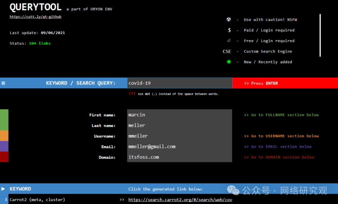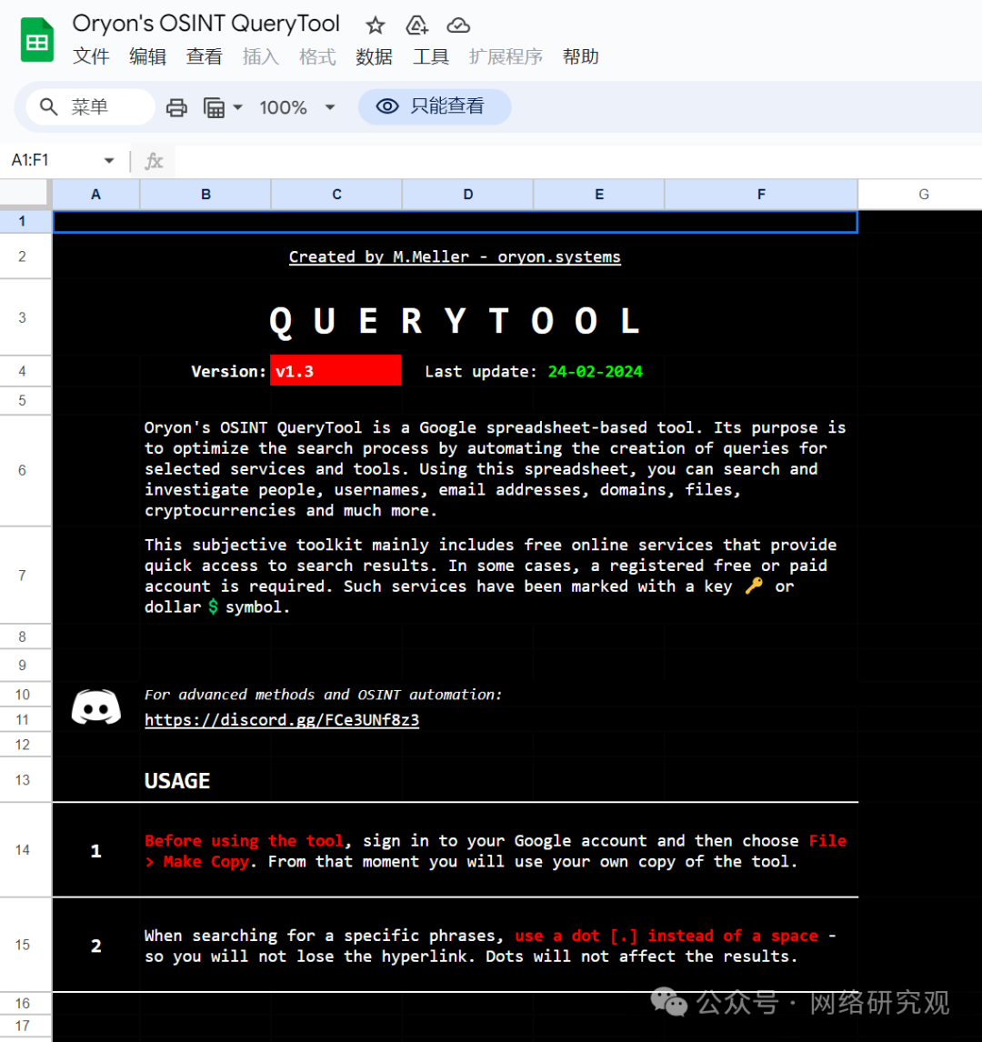 QUERYTOOL - 专为 OSINT 设计的 Google SheetQuerytool 是一个基于 Google Spreadsheet 的 OSINT 框架。使用此工具,您可以对术语、人员、电子邮件地址、文件等进行复杂的搜索。QueryTool 是 Google Sheets 中集成的专用 OSINT 框架,旨在简化生成各种搜索引擎查询以获取特定结果的过程。QueryTool 被设计为侦察的初始步骤,使用户能够对术语、用户名、电子邮件地址、文件等进行复杂的搜索。它主要包括一组便于直接访问搜索结果的资源,并通过一组主观的工具和服务支持网络调查过程。电子表格分为四个部分,每个部分包含有用的搜索工具:1. 侦察与 SOCMINT:用于一般研究目的的搜索引擎和为社交媒体搜索定制的工具。2. 虚拟人力情报:收集和分析个人信息的工具,包括钱包和加密货币交易分析。4. 暗网搜索:Tor 网络的搜索引擎,方便探索和调查暗网内容。1. 登录您的 Google 帐户并导航到 QueryTool 电子表格。2. 选择“文件” > “制作副本”以创建可编辑版本供个人使用。3. 进入所选表格并输入相关数据。无需填写所有字段;提供您可用的信息并在指定区域查看生成的链接。4. 对于搜索特定短语,请用点替换空格以保持超链接功能而不影响搜索结果。5. 重要提示:不要请求访问原始工具。请始终复制一份以供个人使用。