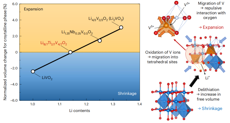 此外,表1比较了不同电极材料(包括Li8/7-yTi2/7V4/7O2与阳离子无序岩盐结构)的体积变化。有趣的是,在这些含有V离子的材料中,V离子从其原始的八面体位置迁移到相邻的和面共享的四面体电荷位置,可能导致体积膨胀而不是收缩,例如Li2VO3(+2.3%)和Li1.25Nb0.25V0.5O2(+1.4%)。这些发现清楚地表明,阳离子的迁移强烈地影响了体积变化的趋势。V离子向较小的四面体位置的迁移不可避免地增加了V离子和O离子之间的排斥性相互作用,从而导致了晶格的膨胀,这种晶格的膨胀会部分被自由体积增加引起的体积收缩所抵消。由于过量锂氧化物不可避免地具有相对较少量的过渡金属离子,因此与化学计量氧化物(与Ti-O和V-O键相比,Li-O键的离子性质更高)相比,膨胀预计会更加明显,它与较弱的键强度相关。同样,热膨胀系数部分取决于材料中的键合,通常具有高共价性质的材料与离子化合物相比具有相对较小的热膨胀系数。当收缩和膨胀平衡良好时,尺寸稳定性保持不变,使得在Li8/7-yTi2/7V4/7O2中观察到几乎尺寸不变的特性。事实上,在锂过量和岩盐的V氧化物中,锂含量与体积收缩/膨胀之间存在明显的相关性(图5)。虽然,对于Li8/7-yTi2/7V4/7O2,通过膨胀法在充电时观察到小体积收缩(在±0.25%以内),预计通过进一步优化化学成分(Li与V含量,图5),将开发电化学循环时真正尺寸不变的材料。