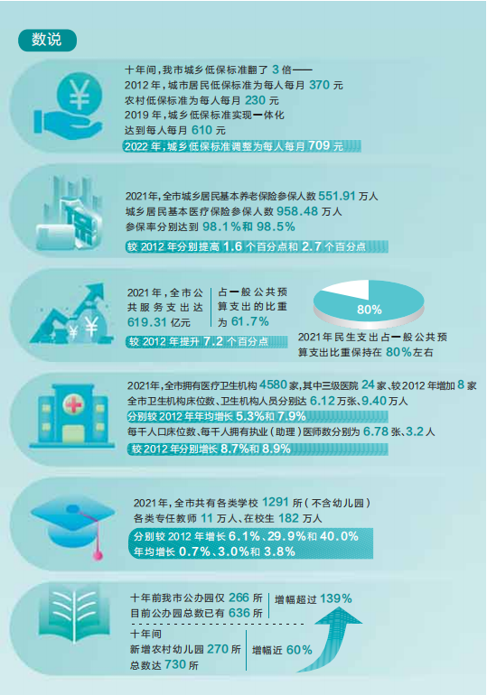 2021年,全市城乡居民基本养老保险参保人数551.91万人、城乡居民基本医疗保险参保人数958.48万人,参保率分别达到98.1%和98.5%、较2012年分别提高1.6个百分点和2.7个百分点。