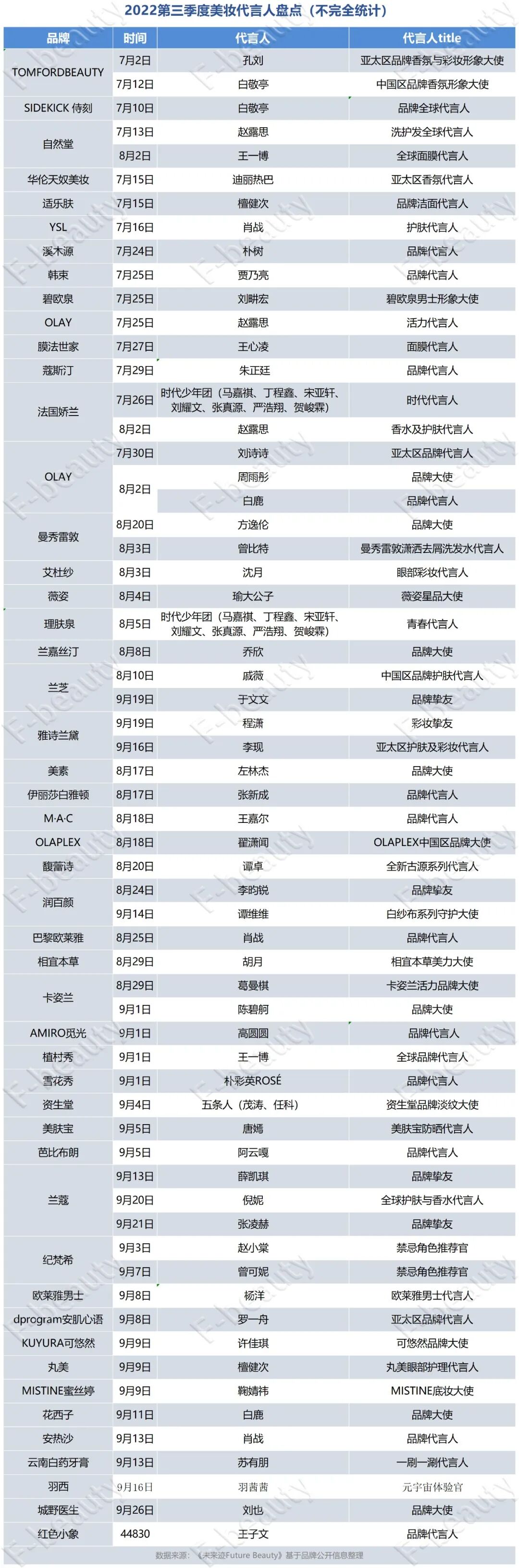 据《未来迹Future Beauty》不完全统计,2022年第三季度,已经有49个美妆品牌陆续官宣了60位代言人。官宣新代言的品牌和代言人总数相比第一季度分别下滑17%和14%。