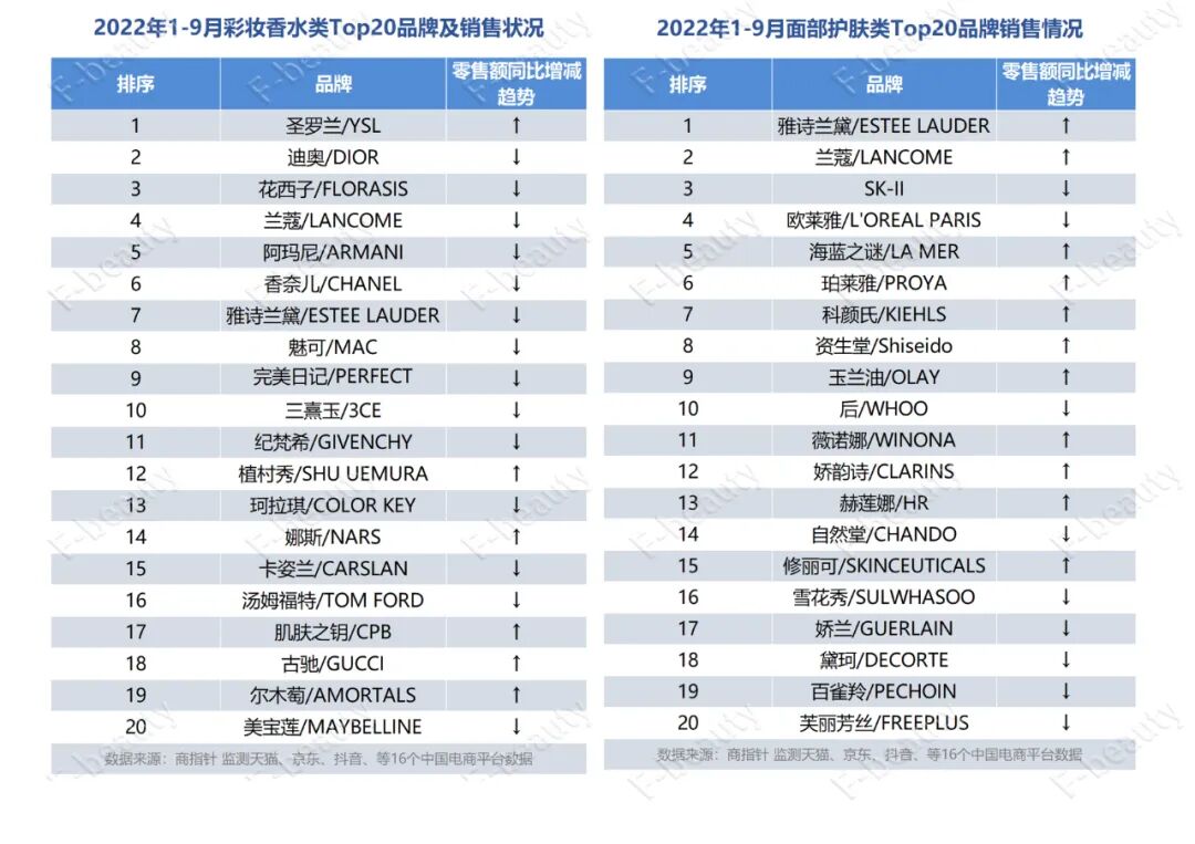 2022年1-9月面部护肤TOP20的品牌中,近五成品牌的销售额同比下滑,彩妆香水品类Top20中则有14个品牌的零售额同比呈下滑状态。