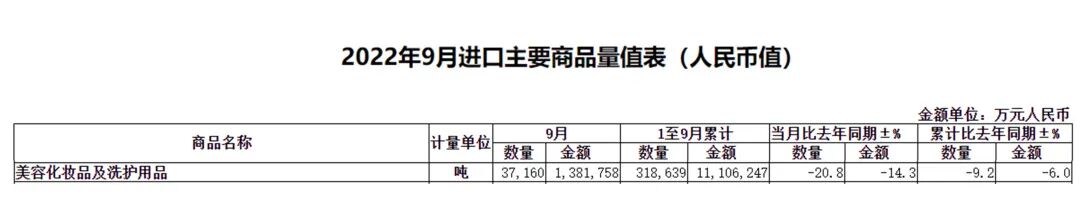 在所有进口商品中,美容化妆品及洗护用品类9月进口37160.1吨,和去年同期相比下滑20.97%;进口金额为138.2亿元,同比下滑14.32%;1-9月累计进口318639吨,和去年同期比下滑9.2%;进口金额为1110.6亿元,同比下滑6%。