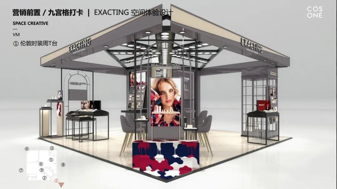 马万山在设计EXACTING品牌创意时,提出了空间中的互动体验故事化和九宫格打卡空间社交论。在快记忆,快传播,快转换的时代,人人都是自媒体。一个浸没式的体验空间,必须预设9个以上的打卡位置,用于自媒体打卡。如果品牌设计的打卡位置少于九个,会被认为是失败的设计。在EXACTING看来每位打卡人都能完成对品牌形象的二次传播。