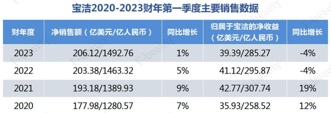根据宝洁近4个财年同季度主要销售数据可知,自2020财年开始,宝洁净销售额增速就在逐渐放缓,同比增长值从9%下降到1%。归属于宝洁的净收益也连续两年出现负增长,同比下降4%。
