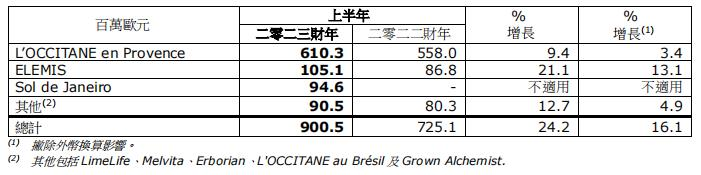 期间,欧舒丹所有主要品牌也在上半财年均录得增长。主要贡献来自L’OCCITANE en Provence、ELEMIS以及Sol de Janeiro的推动。