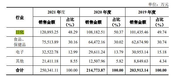 招股书显示,其日化行业主要包括化妆品、口腔护理、个人及家庭护理用品等细分领域。其中,宝洁为其日化行业第一大客户,2019年-2021年三年间,销售收入分别为4.85亿元、4.76亿元和5.34亿元,分别占营业收入比重为23.5%、21.86%、21.01%。
