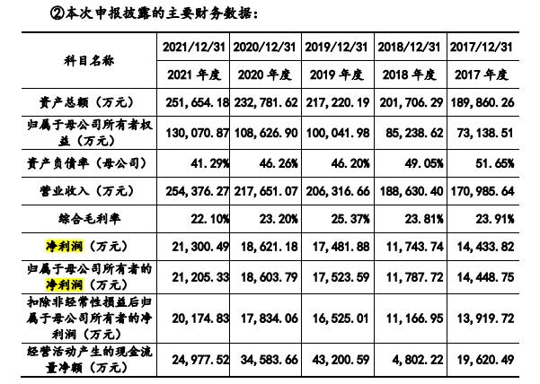 据招股书显示,中荣股份自2017-2021年五年期间,营收从17.09亿元增长至25.4亿元,归母净利润从2017年的1.44亿元增长至2021年的2.12亿元,整体增长曲线较为平稳。但综合毛利率一栏中,却在近年来波动起伏频繁,2019-2021年期间,从25.37%下滑至22.1%。