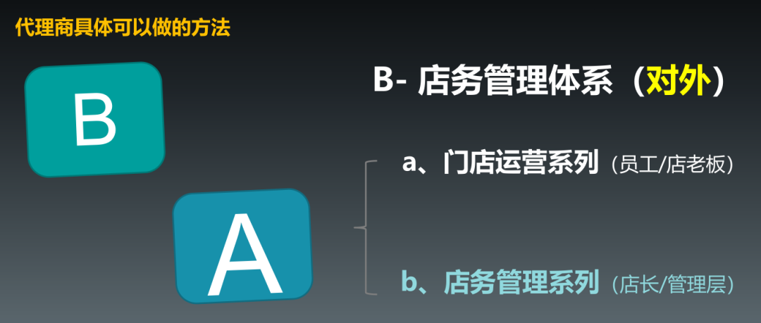 从代理商的层面可以做这两个方面着手:对内,内部团队要去搭建专业技能体系;对外,要给客户、合作的这四类的门店做“门店店务体系的搭建”。