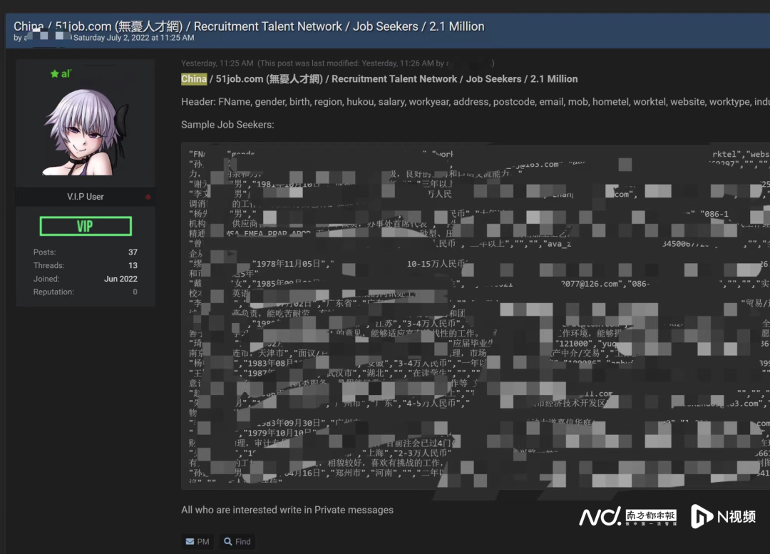 7月3日,有用户在网上发帖称出售海量数据库,该用户提供的数据“样本”中,显示了“51job”“百胜中国”及“布丁酒店”等公司的用户数据,其中疑似为51job用户信息样本显示近30条含有个人姓名、性别、出生日期、地点、应聘岗位、薪酬预期以及个人联系方式的用户数据,引发热议。