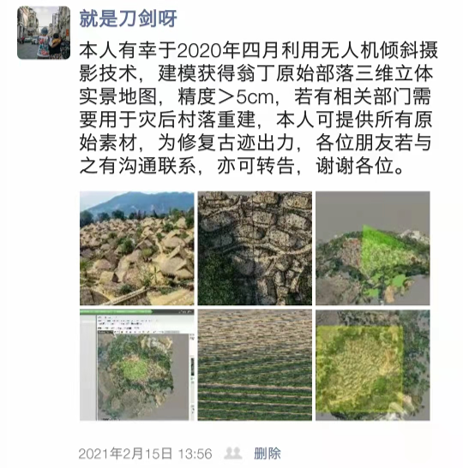 “我没有想到一次不经意的‘倾斜摄影’使翁丁古寨在云端地球复活”刀剑继续说道,“起初我只是因为自己摄影的爱好拍了这些照片,我并不是专业的测绘人士,也是刚好在公众号平台上看到了有关‘云端地球’的介绍,只需要将拍摄到的照片上传,就可以得到三维建模,于是便尝试了一下,没想到会这么便捷地就建模成功了。”