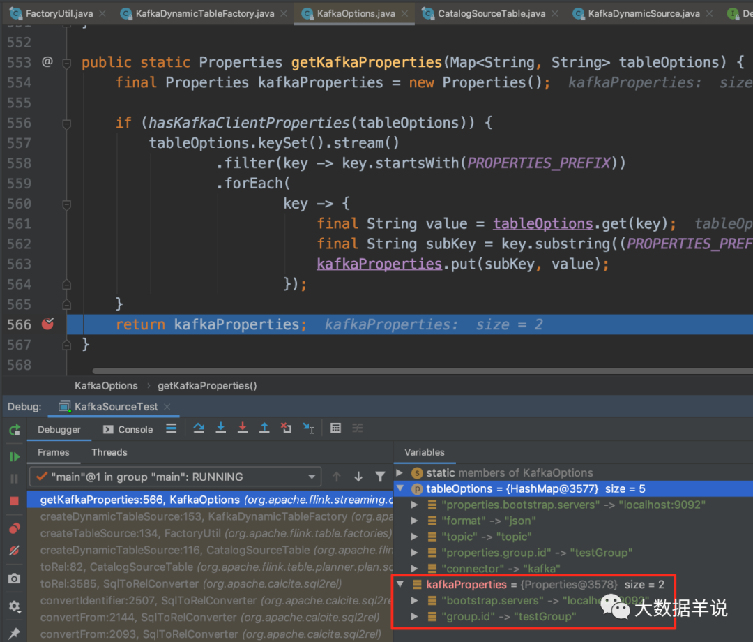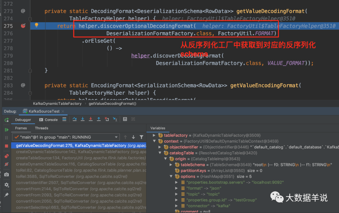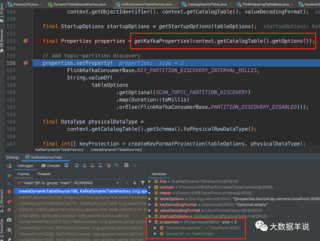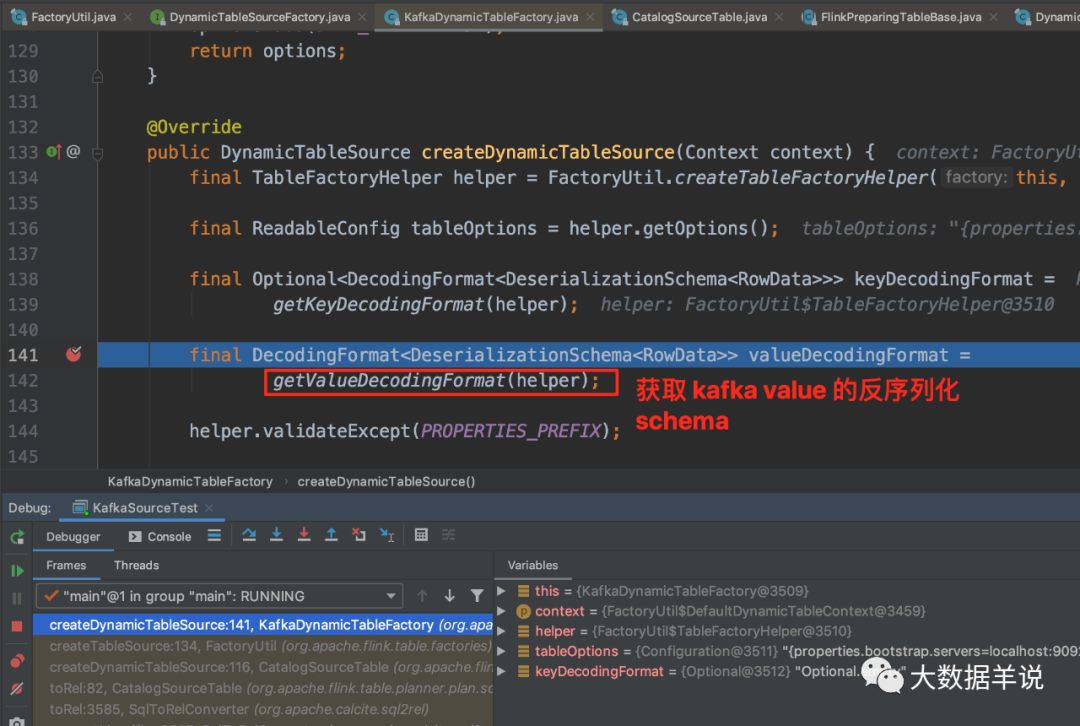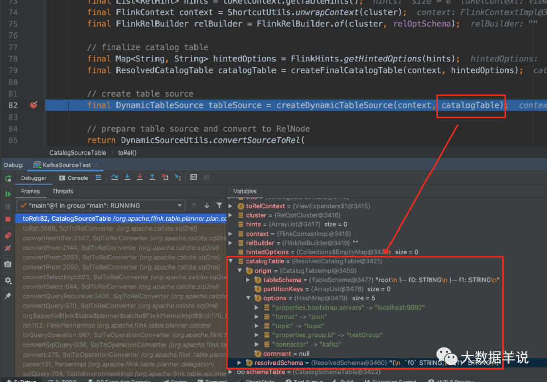 我们往前回溯一下,定位到 CatalogSourceTable 中的 82 行(源码基于 1.13.1),发现 tableSource 已经是 KafkaDynamicSource,因此可以确定就是这一行代码将 connector = kafka 映射到 FlinkKafkaConsumer 的。