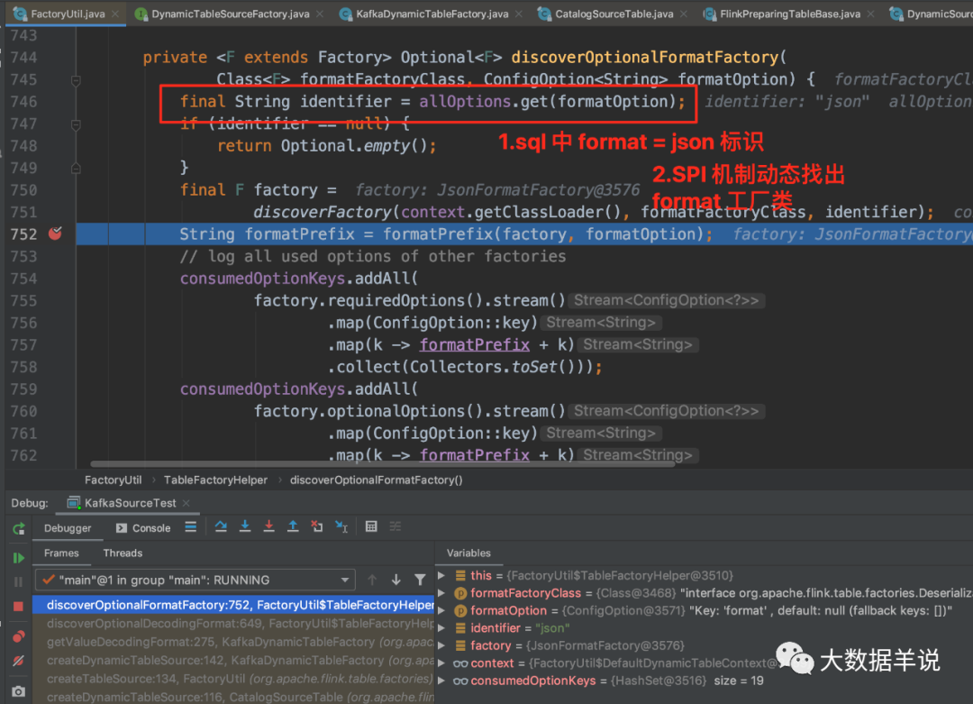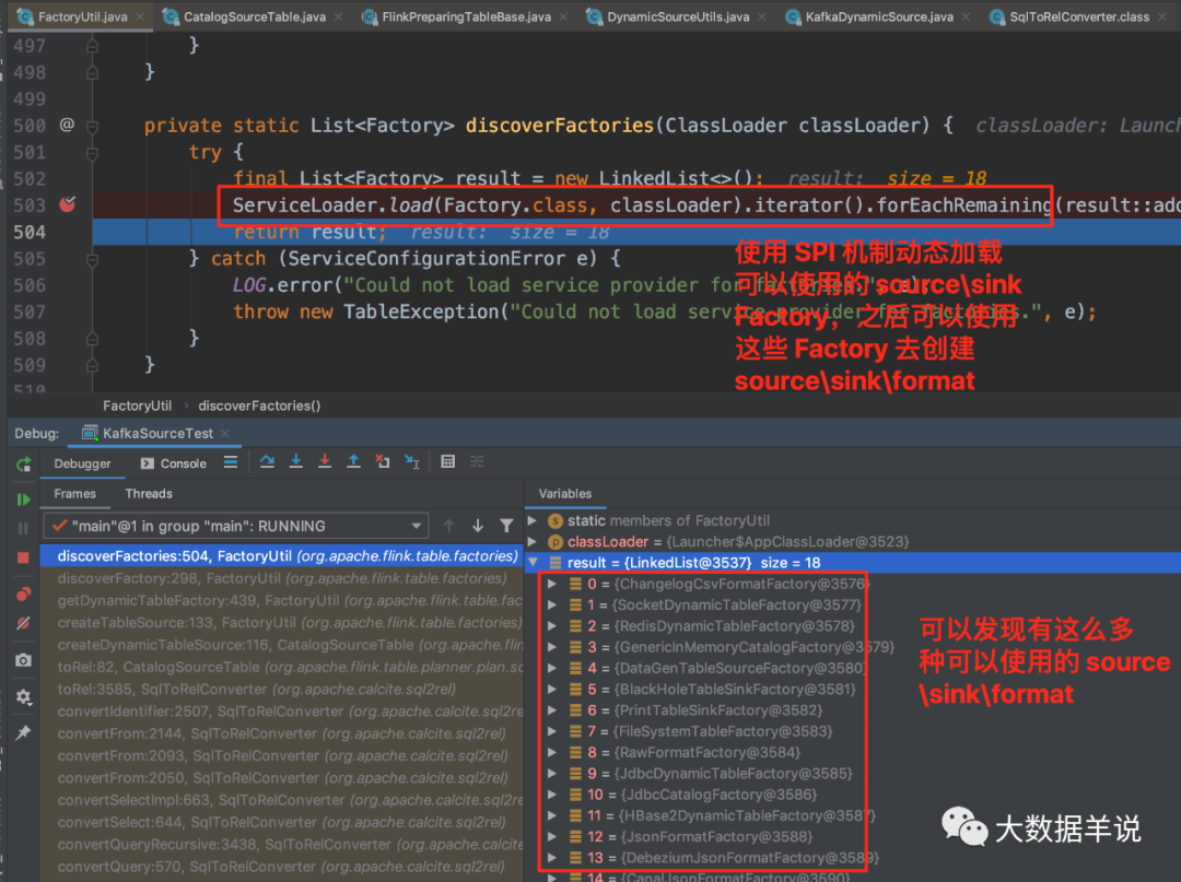 Factory 的工厂实例。通过截图可以看到有好多 source\sink\format Factory。关于 SPI 可以参考 https://www.jianshu.com/p/3a3edbcd8f24DynamicTableSourceFactory.class 的标识去过滤出 KafkaDynamicTableFactory。然后 KafkaDynamicTableFactory.createDynamicTableSource 去创建对应的 source。