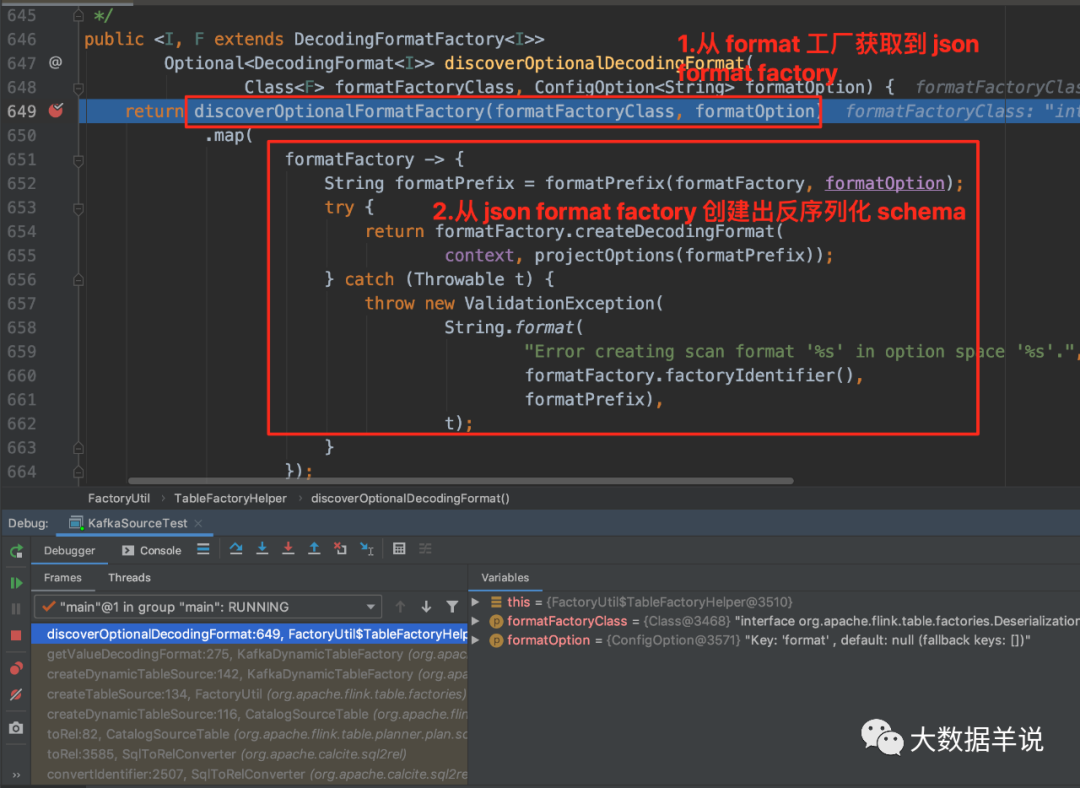 Factory 的 format 工厂实例。DeserializationFormatFactory.class 去过滤出 JsonFormatFactory。结论: