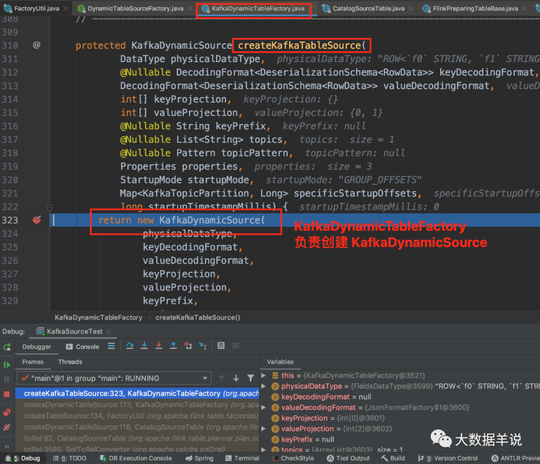 可以看到 KafkaDynamicTableFactory.createDynamicTableSource 中调用 KafkaDynamicTableFactory.createKafkaTableSource 来创建 KafkaDynamicSource。