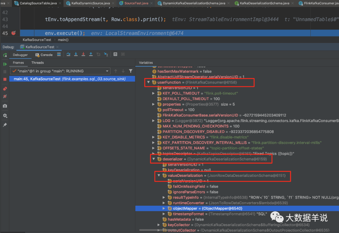 如图可以发现当 debug 到当前断点时,已经进入 FlinkKafkaConsumer source 的创建阶段了,执行到这里的时候已经是完成了 sql connector 和具体实际 connector 的映射了。那么 connector 怎样映射到具体算子的过程呢?