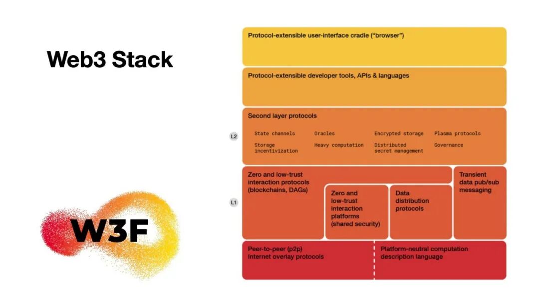 Web3基金会定义了Web3的技术栈。区块链领域熟知的Layer0,Layer1等分层模型就是来自这个技术栈。