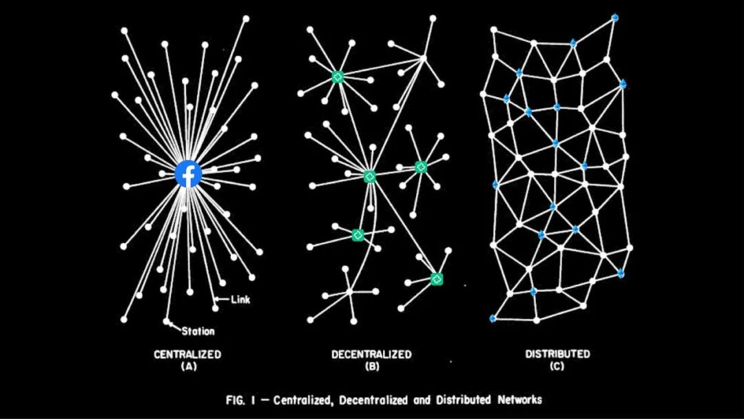 Facebook代表了中心化,Element 代表了去中心化,以太坊代表了真正的分布式。这张经典图出自Paul Baran 1964年发表的文章《On Distributed Communications》。另外,Element是一款通讯工具,它能让你在家中与世界各地的人交谈的同时保留自己的隐私。