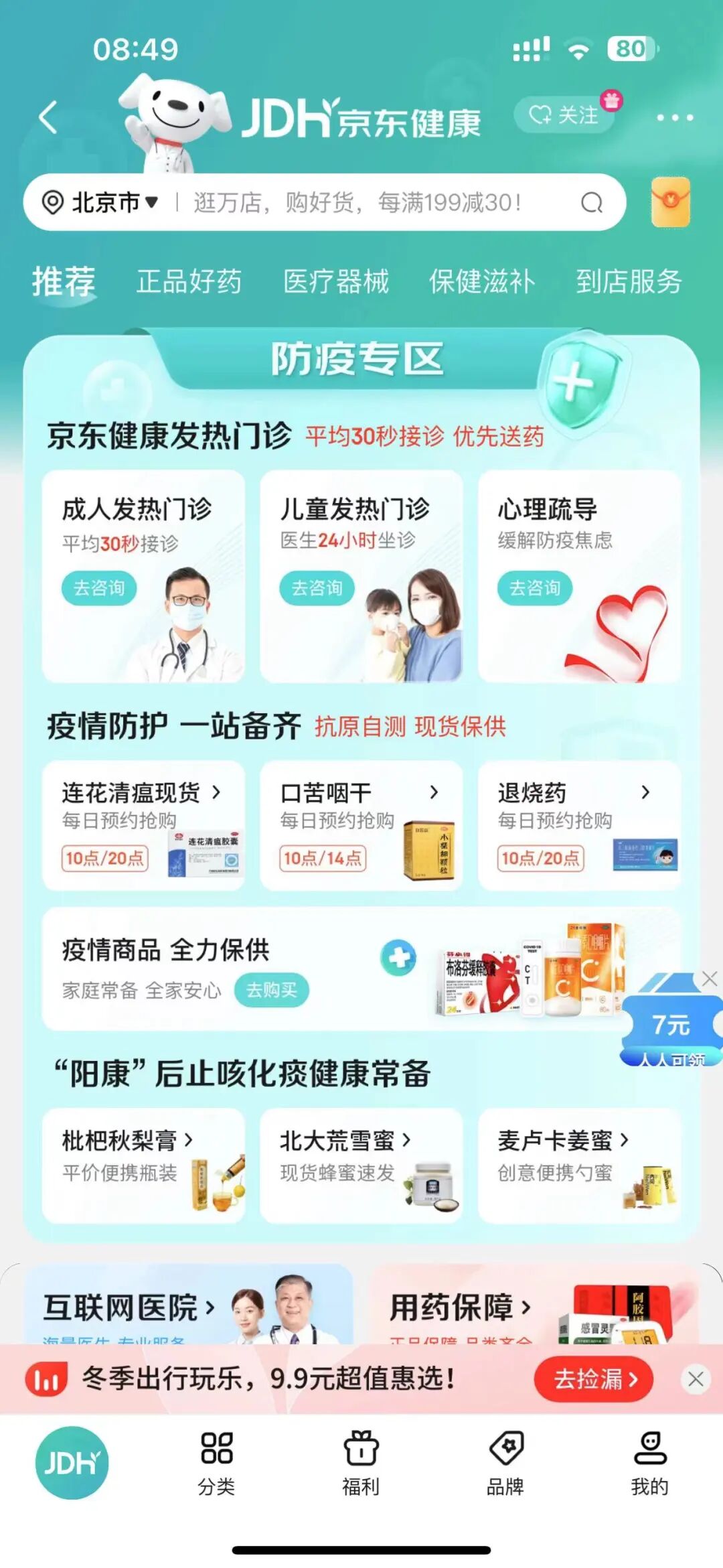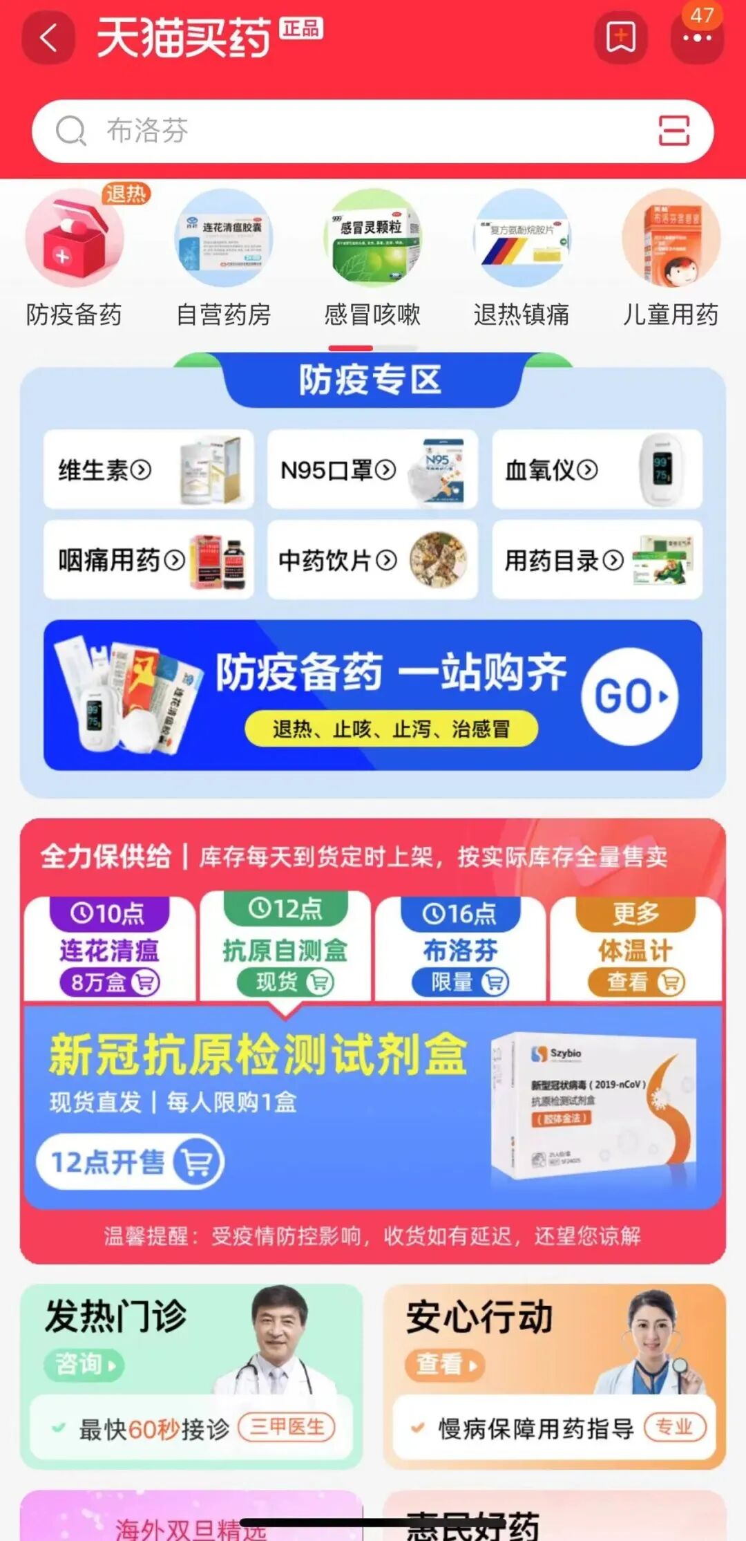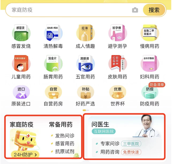 正如其名,这是一个药物交换互助的平台,该平台的功能分为「我需要药」与「我有更多的药」两类信息,需要药物的用户可以通过该小程序发布“求助信息”,有多余药物的用户可以互帮互助,通过该小程序联系需要帮助的人。在这个小程序中,腾讯地图基于位置定位功能,会在首页呈现距离用户最近的求助信息。不过,在此需要注意的是,该小程序平台提供的互助药品清单选项为国家卫健委推荐的居家常备非处方药。同时,作为药物交换平台,其无法对线下互助的药物进行真伪鉴证等,不过该平台提供实名认证,虽有一定保证,但还是建议用户应当自行鉴别药物真伪、有效日期等。除吃之外,该小程序还提供了「发热门诊」和「新冠疫苗」地图,如果有持续高烧不退、引发基础性疾病等症状,建议还是去「发热门诊」等医院尽早治疗。作为电商平台,针对大众匮乏的基础抗疫药品,京东健康在更早之前便开始了行动。从“发热门诊”线上咨询到应急药品如退烧药、咽喉肿痛药等,再到阳康之后的常备药品,一应俱全。不过,因为需求量庞大,药物也在陆续生产,京东在每天设置了多个整点时间段,限量供应,一次没抢到的小伙伴,可以多预约几次。值得肯定的是,根据京东黑板报透露,京东健康携手中国非处方药物协会,联合了华润三九、云南白药、中美史克、同仁堂、以岭药业等国内外超过三十家知名药企,从源头保障正品好药的供应稳定、价格稳定。“不断供、不涨价”是其主要原则,据悉,在呼吸系统用药、感冒用药、止痛镇痛用药、消化系统用药等抗疫相关品类中,包括自营药品仓的现货储备量和在途订单量在内,京东大药房正在向社会民众平价保供药品数量超过一亿盒。阿里旗下的淘宝主要提供了两个渠道供药:天猫买药和阿里健康大药房。其中打开手机淘宝 App,找到“天猫买药”,每天 10 点、12 点、16 点有连花清瘟、布洛芬、抗原自测盒等防疫用品的抢购。![]()