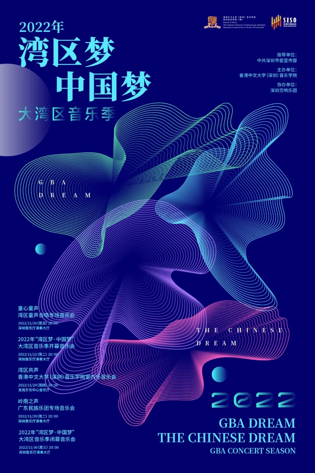 本次2022年“湾区梦·中国梦”大湾区音乐季活动从11月20日开始,为期11天,共举办包括交响乐、室内乐、民族器乐、童声合唱等共五场音乐艺术展演,分别是: