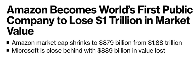 最近,美国电商巨头亚马逊的股价大幅暴跌,已成全球史上第一家市值损失超过一万亿美元的上市公司。