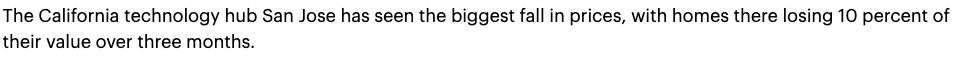 加州科技中心圣何塞的房价跌幅最大,三个月内跌了10%。