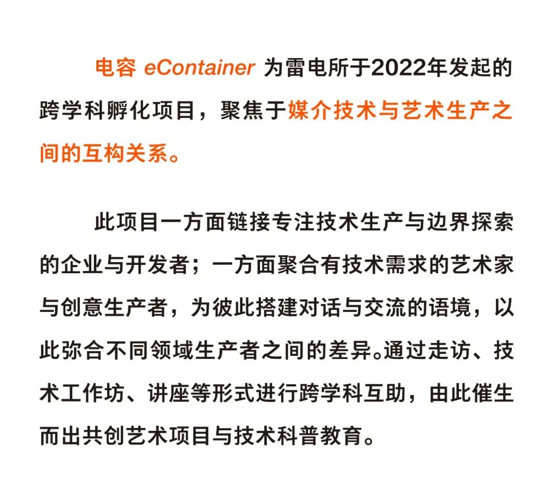 “青年科技艺术扶持计划”致力于发掘和扶持具有跨学科实践能力的青年艺术家个人及团体。当艺术和边界被数字媒介、科技、游戏等种种新经验所敲开,艺术家被赋予了新的要求和可能性。“青年科技艺术扶持计划”秉承公开公正的评审原则,注重作品的实验性和可持续性。伴随一系列持续性时间的开展,切实地为即将或刚刚离开校园的青年创意工作者留出实验的天地。「雷电所」(Raiden INST)成⽴于2020年通过跨学科的合作,探索艺术、科技、⾃然的边界,以及技术与⼈类认识和感官的内在联系;同时,致⼒于实践⽩盒⼦之外的展示可能性,以策展⼈、艺术家等身份存在,具有很强的灵活性和合作性。本次活动也是「雷电所」的⾸次对外亮相,负责驻地、策展等活动。欢迎点击上方链接