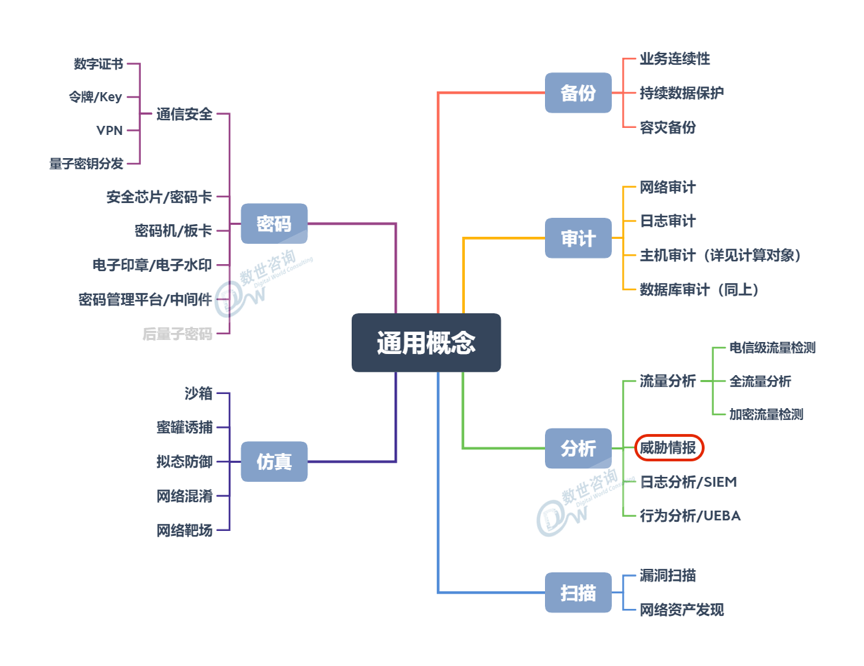 威胁情报在数据咨询2020年发布的《中国网络安全能力图谱》中属于 “通用概念”维度中的“分析”中的二级分类。