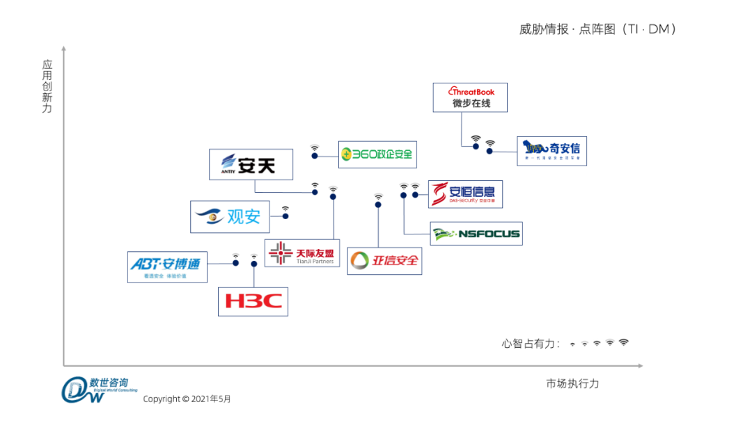经过调查与沟通,在20余家具备威胁情报能力的安全厂商中有11家入选本次威胁情报点阵图,分别为:安博通、安恒信息、安天、奇安信、观安信息、360、天际友盟、新华三、绿盟科技、微步在线、亚信安全。其中天际友盟和微步在线2家企业,是目前国内围绕威胁情报展开业务的厂商。另外9家网络安全企业均拥有不同特色的威胁情报数据,并将其赋能于其他安全产品。